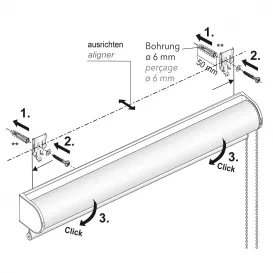 Die im Lieferumfang enthaltene Befestigungsschiene ermöglicht eine vereinfachte Montage über Clipse, welche in horizontaler Ebene verschoben werden können. Die Befestigungsschiene kann für Wand- oder Deckenmontage eingesetzt werden. Die Rollo Technik ist in den Farben Aluminium und Weiß erhältlich. Auf Anfrage sind weitere Farben, sowie eine Kassette/Blende, oder zusätzliches Sonderzubehör und weitere Zusatzausstattungen möglich. Akustik Rollo COLOURS überzeugt durch eine einfache und komfortable Bedienung mittels hochwertigem Metall- Kettenzug,