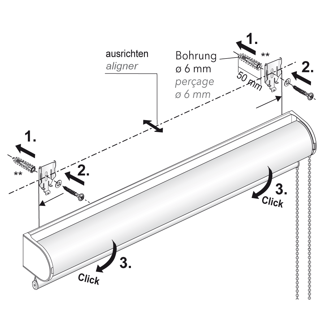 Lieferumfang: Rollo inkl. Befestigungsschiene für vereinfachte Montage, Bedienung über Endloskette, Behang mit Fallstab (innenliegend), Befestigungszubehör und Montageanleitung