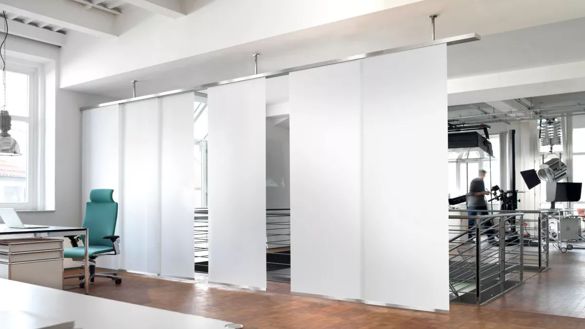 Interstil F1 als Raumteiler in Ihren Räumen einzusetzen, ist mit einer rückseitigen Blende möglich. Dabei kann das Interstil F1 Flächenvorhang System direkt an die Decke. Anfertigung nach Maß, z.B. 160 cm, Preis pro Stück, ab