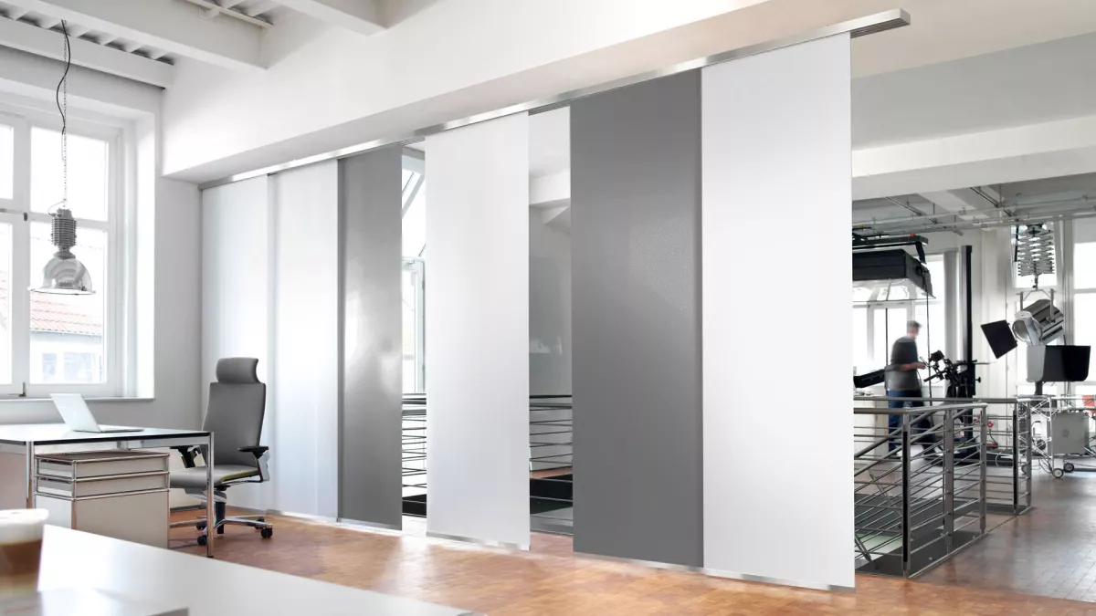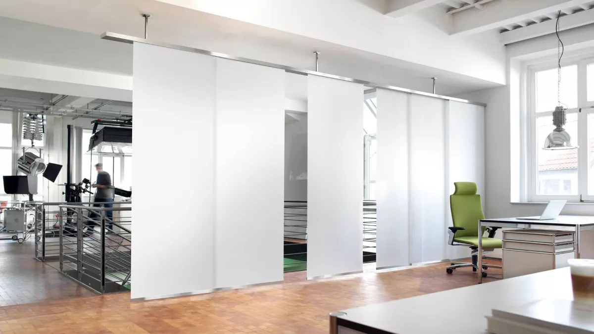 Interstil F1 als Raumteiler in Ihren Räumen einzusetzen, ist mit einer rückseitigen Blende möglich. Dabei kann das Interstil F1 Flächenvorhang System direkt an die Decke oder mittels Deckenabhänger montiert werden. JETZT NEU: auch in SCHWARZ mit langer Deckenabhängung möglich.